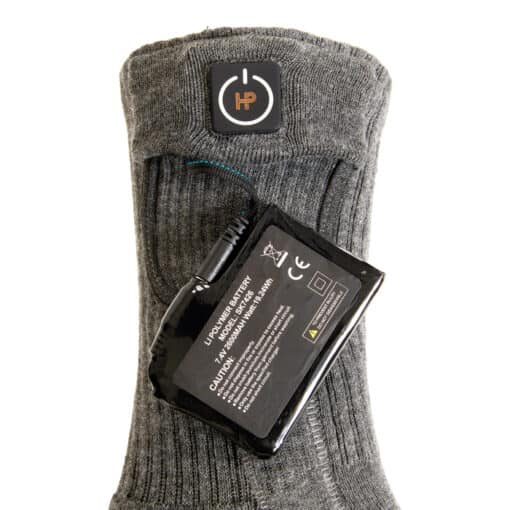 - Each sock is powered by a powerful 7.4V – 2600 mAh lithium battery. It provides 2 to 6 hours of heat, depending on the heat setting selected and the ambient temperature.